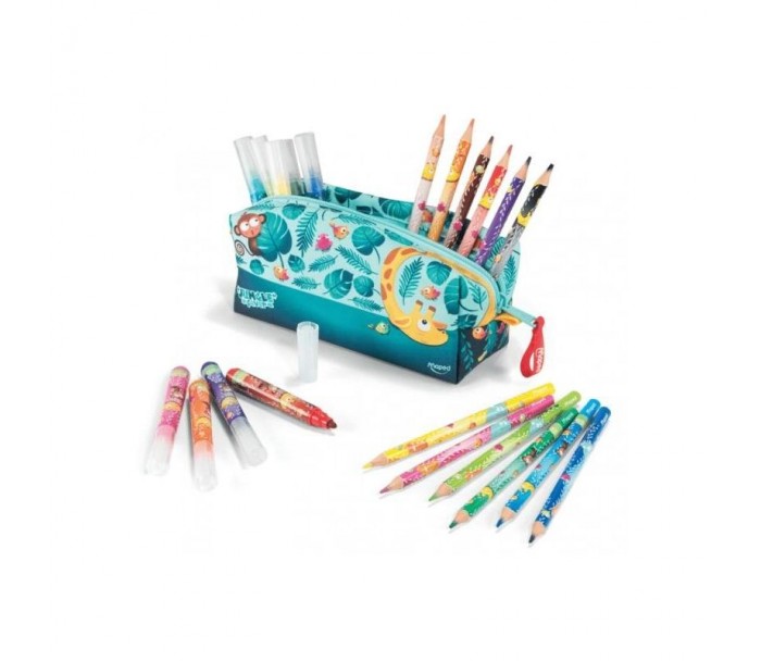 ¡Este bonito estuche decorado con motivos selváticos y simpáticos animales acompañará a los más pequeños en todas sus aventuras creativas!
